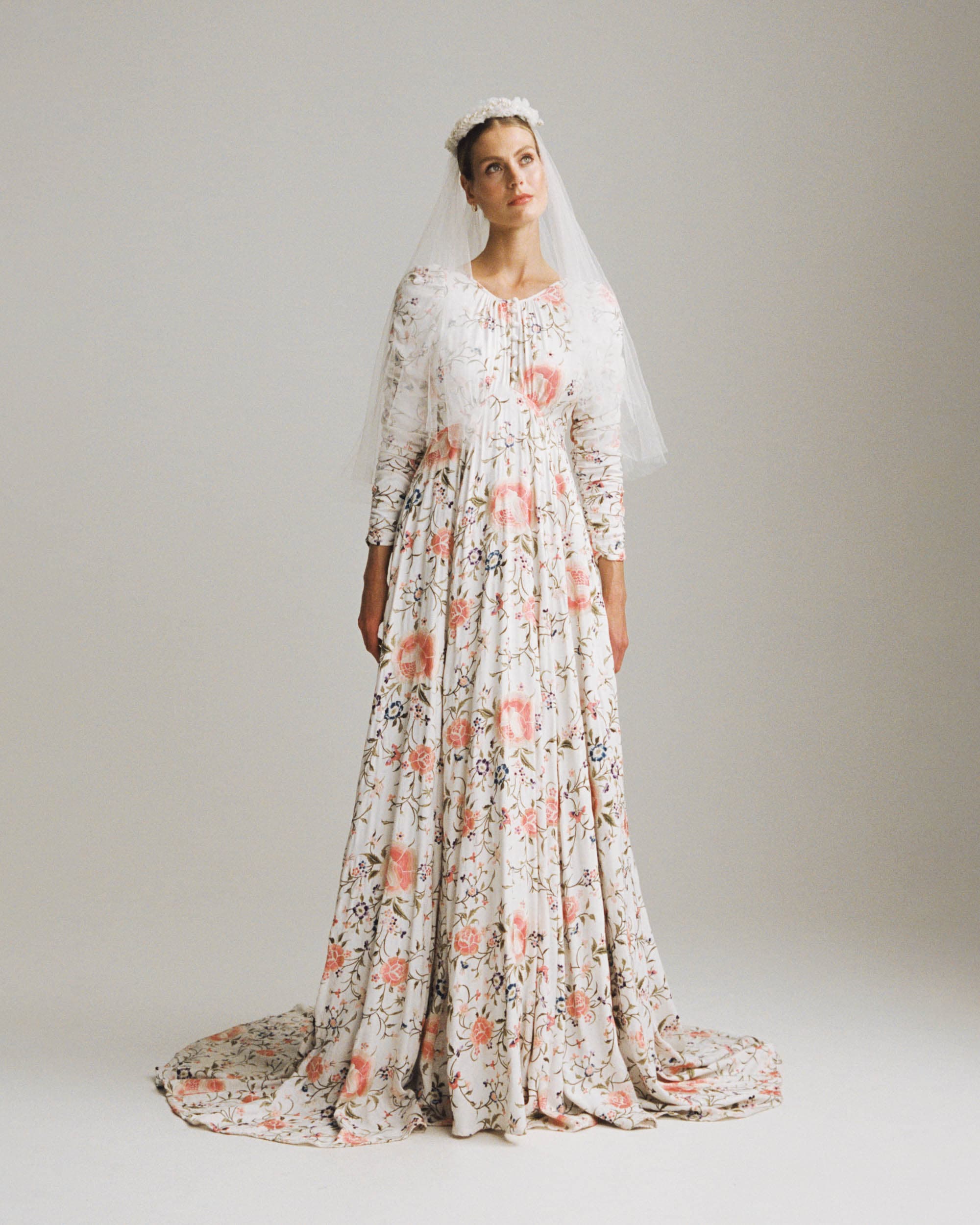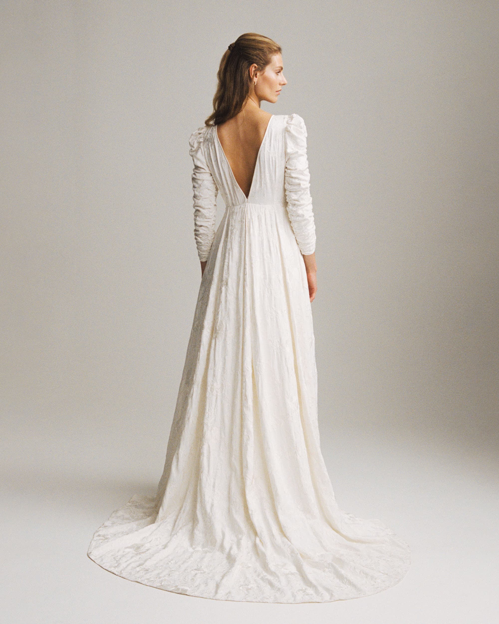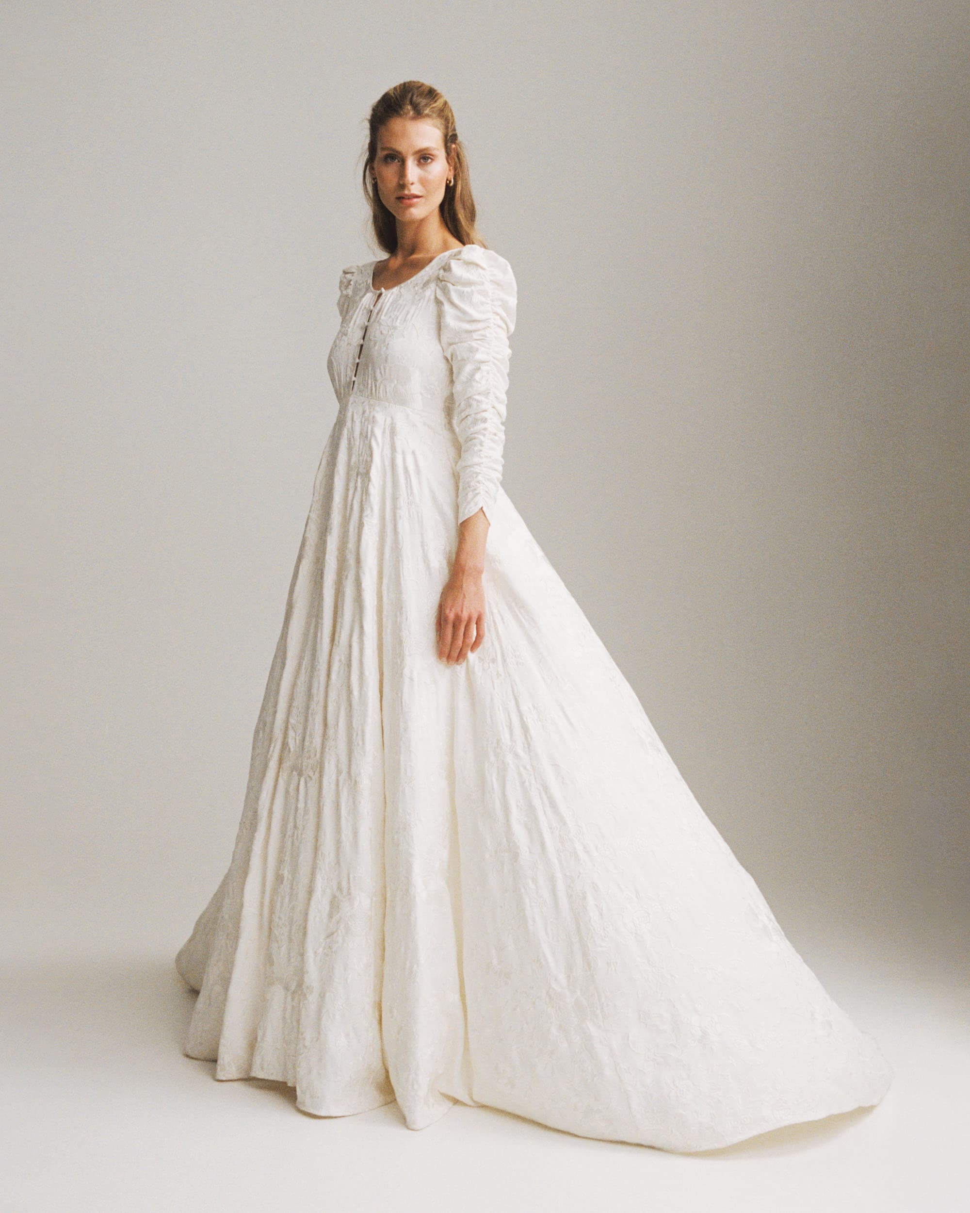 An embroidered wedding dress made in an exclusive and sustainably certified Viscose Satin in a beautiful jacquard pattern. The fabric has embroideries all over, made in delicate pastel colours. The dress has a round neckline, with fabric covered buttons. The dress emphasizes the waistline before it flows out to a voluminous skirt. The sleeves are made of rouching and the skirt of the dress is lined with tulle.
