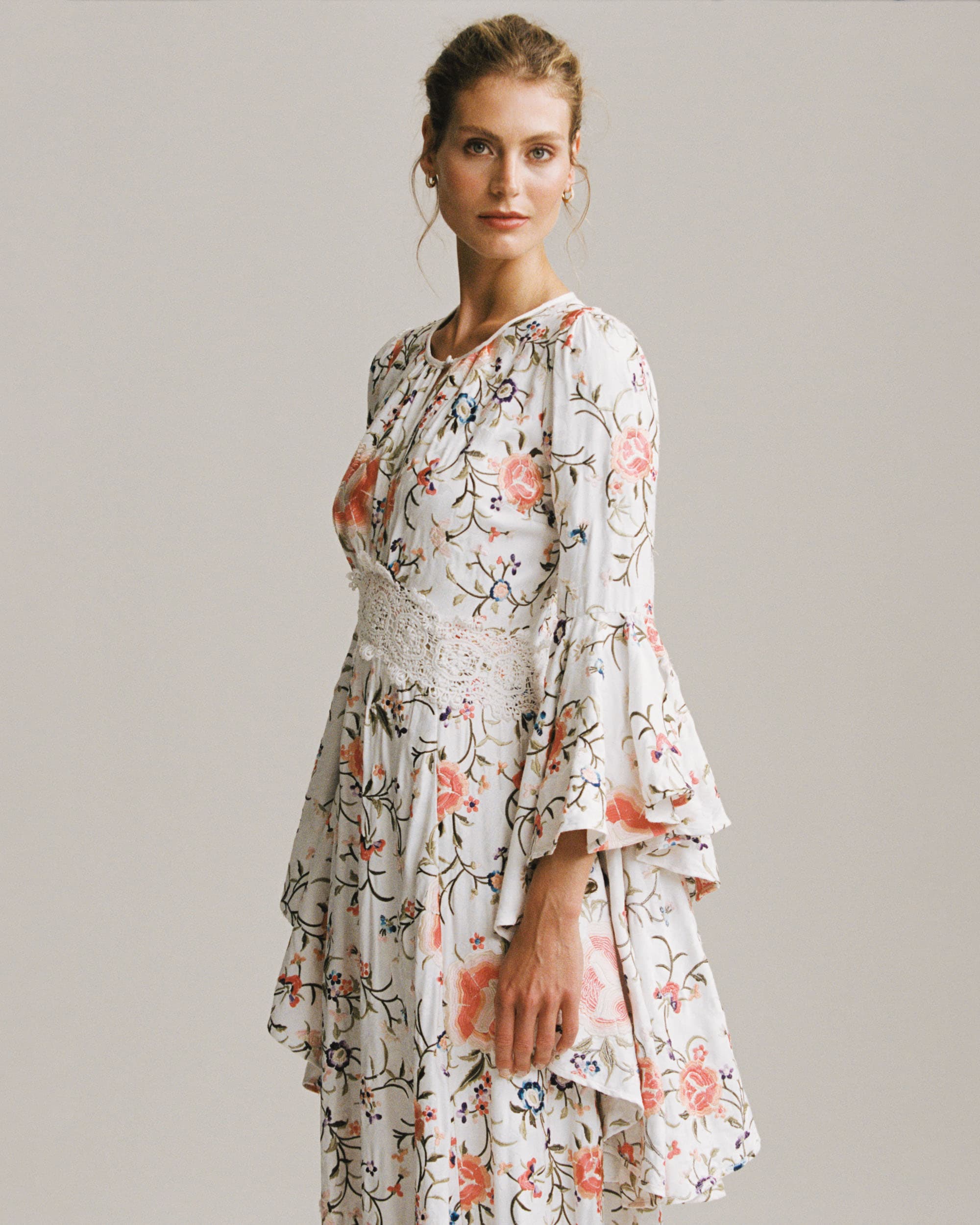 This embroidered wedding dress is made in an exclusive and sustainably certified Viscose Jacquard Satin. The fabric has embroideries all over, made in delicate pastel colours. The embroidery is inspired by an antique kimono found in Tine’s vintage archive. The dress has flared, 70’s inspired sleeves, it goes in at the waistline with unique lace details and has a full length.